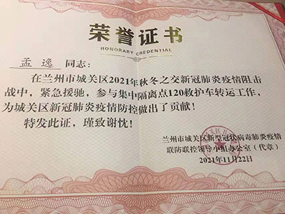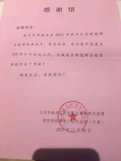 在兰州市城关区2021年秋冬之交新冠肺炎疫情阻击战中,孟逸同志紧急驰援,参与了75天兰州市集中隔离点120救护车转运工作,为城关区新冠肺炎疫情防控作出了贡献,受到了兰州市城关区新型冠状病毒肺炎疫情联防联控领导小组的肯定和表扬。孟逸同志在经过14天隔离观察后,于今天早上光荣返回工作岗位。